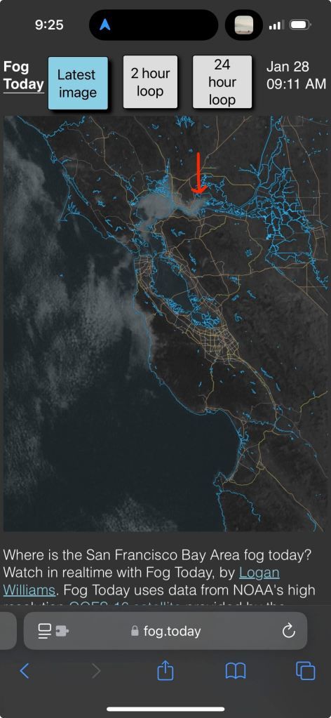 For day 17, I planned to spend the day in Benicia, CA, painting the bay views along the shoreline. Unfortunately, while driving up there, visibility dropped steeply when I started approaching the area with surrounding fog in every direction. After consulting satellite photos, it seemed to just be affecting that small region: