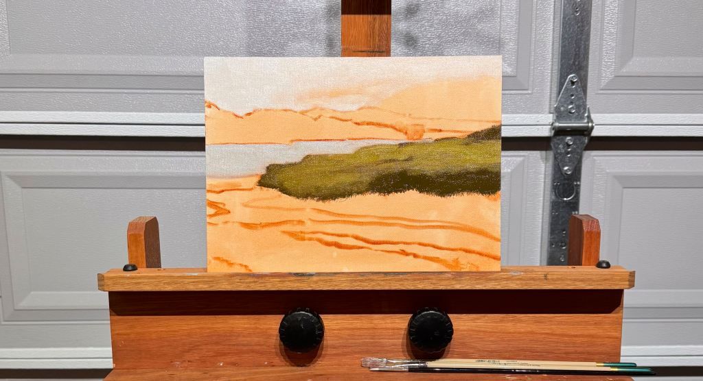 It’s day 2 of the final week of my residency and my final project is a 15” x 30” painting of a scene in Inverness, CA. On Day 1, I designed the composition, drew the outlines of the big shapes, laid down an underpainting, and blocked in the background and mid-ground.