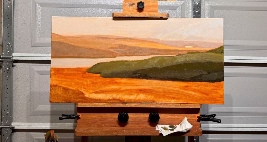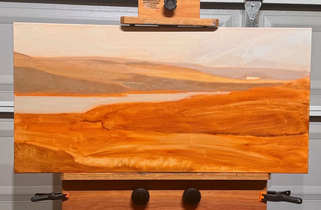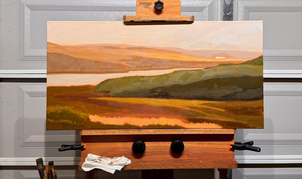 I spent the entire day focused on the foreground and I had to work through a series of challenges. First off, I was feeling pleased with how the painting was coming together, particularly the background hills: